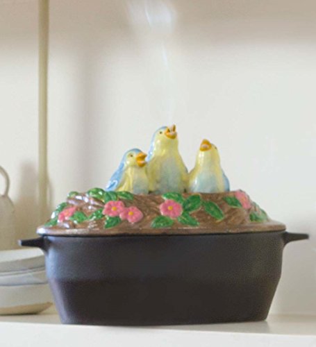 Plow & Hearth Exclusive - A sweet accent for your nest, our Bluebird Steamer diffuses steam from the middle bird's beak, creating cleaner air for your home. Fill steamer with water and set it on wood stove for best results. Holds approx. 2 qts. Sturdy, cast iron steamer is ideal for dry weather and makes a great humidifier alternative. Size: 12''L x 7½''W x 8½''H.